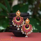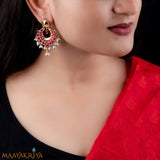 The mango(amra) shaped motifs made of Sterling Silver 92.5% with Kempu stones have been joined to form a moon shape and rice paerls hanging at the bottom gives a enticing look to this piece of jewellery.