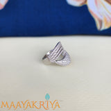 Embrace the allure of illusion with this designer silver ring. Crafted with a skillful blend of textures and shapes, it creates a mesmerizing mirage effect that draws attention. The ring's graceful curves and intricate detailing make it a captivating addition to any jewelry collection.