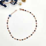 Enhance your style with our Rosegold Blue Evil Eye Anklet, featuring a stunning rose gold and blue evil eye charm with a black bead. Protect yourself from negative energies while making a fashion statement. Handcrafted with quality materials, this anklet is perfect for any occasion.