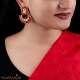 This Silver handcrafted Chand Bali Lakshmi Earrings with Mango Motifs and kempu stones looks very ethnic when worn with traditional and contemporary attire.