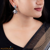 Simple but an elegant 92.5 Silver Oxidized Chandrabindu (Moon dot) Earrings with kempu stones at the bottom and real fresh water pearls hanging in the middle of the Earrings gives a spectacular look when worn.