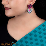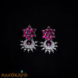 This Suryakanti or the Sunflower Silver Handcrafted earrings with Kempu Zircons and a moon shaped pendant attached gives a Glorious look when worn.