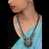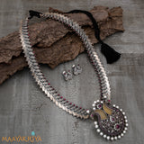 Unique combination of Tiger nail and Lakshmi kasu in one jewellery is very rare to find.This oxidized temple necklace has been deigned delicately to suit your traditional attires . It has been handcrafted in pure silver and the kempu and white cubic Zircons are giving a highlight to the whole necklace.