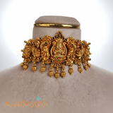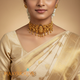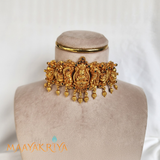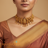 The Lakshmika Choker is an exquisite piece featuring a seated Lakshmi figure at its center, flanked by an ornate peacock design that symbolizes grace and prosperity. Delicate kempu stones are interspersed throughout, adding warmth and radiance to this devotional accessory. This elegant choker blends spiritual significance with refined craftsmanship, making it a perfect choice for festive celebrations and cultural occasions.