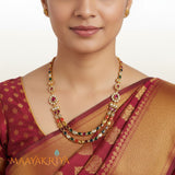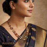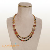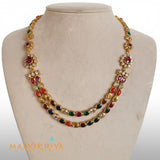 Embrace divine elegance with the Mridula Navarathna Necklace, a stunning two-layered design featuring the nine sacred gemstones of navarathna. Each stone is thoughtfully selected and arranged to create a mesmerizing interplay of colours and energies, symbolizing balance and prosperity. Crafted in 92.5% sterling silver with gold polish, this 10-inch necklace includes an adjustable tazzle for the perfect fit. Ideal for weddings, spiritual occasions, and celebrations, this versatile piece brings timeless beauty and auspicious significance to your collection.