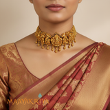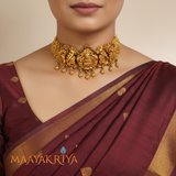 The Shrivalli Kempu Choker features a graceful seated Lakshmi at its heart, complemented by delicate flower motifs that bloom along the sides. Rich kempu stones enhance the piece with their warm, radiant glow, creating an aura of divine elegance and prosperity. The intricate floral designs add botanical charm while maintaining the spiritual essence of this devotional accessory. Perfect for festive gatherings and sacred occasions, this choker merges artistic craftsmanship with meaningful symbolism in a truly captivating way.