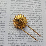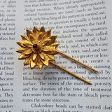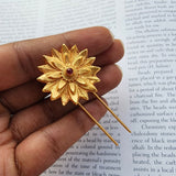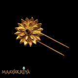 This elegant Maayakriya hair pin is crafted from pure 92.5 silver and finished in antique gold tone. Shaped like a blooming flower with layered petals and a central gemstone, it radiates timeless charm. Perfect for traditional buns or festive hairstyles, it adds a graceful vintage touch to your look.