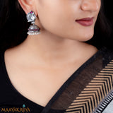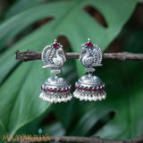 A very unique design with Peacock motifs . The Prapadika Jhumka is embellished with Kempu stones and is handcrafted in Silver and Oxidized.