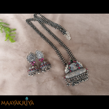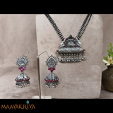 The Vibhuti Necklace is made into a Mangalsutra in silver. The Mangalsutra is made of black beads and Godess Lakshmi and a five head mythological serpent over the Godess . Mangalsutra is worn by Hindu women as a symbol of matrimony.The silver Mangulsutra here is handmade with Temple Jewellery methods by the best artisans.