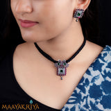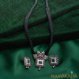 The Chathurashra/Square shaped pendant with 2 beautiful dancing peacocks on top of the square is an highlight of this Pure 92.5 Silver handcrafted pendant with an oxidized finish along with kempu, pache and bili stones (Red,green and white stones).This pretty and elegant pendant and earrings can be worn with traditional and contemporary attires.