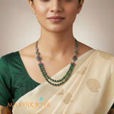 The Anvitha Necklace is a stunning double-layered, double-sided design that showcases the rich warmth of kempu stones on one side and the verdant elegance of pacche stones on the other. This versatile piece allows you to switch between two distinct looks, offering maximum style flexibility for any occasion. Crafted with precision, the contrasting gemstones create a captivating visual balance that celebrates both tradition and contemporary design sensibilities.