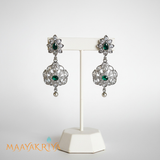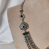 The Ishita Necklace combines vintage charm with contemporary design through its oxidized finish and sophisticated two-layer construction. Featuring a captivating mix of white kempu and lush green stones, this piece creates a striking contrast that draws the eye and adds depth to your ensemble. The oxidized metal base provides an antique aesthetic that beautifully complements the gemstone palette, making it an ideal choice for those seeking a statement piece with cultural resonance. Perfect for festive celebrations or adding understated elegance to your everyday look.