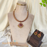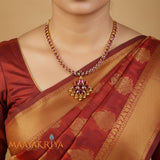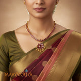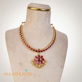 Kempstone Necklace features vibrant kempu stones arranged in an elegant flower design, complemented by traditional craftsmanship. Crafted in 92.5% sterling silver with gold polish, this 10-inch necklace combines classic beauty with contemporary style. The adjustable tazzle fastening allows you to customize the length for a perfect fit. Ideal for festive occasions or everyday elegance, this piece showcases intricate detailing and timeless appeal that enhances any wardrobe.
